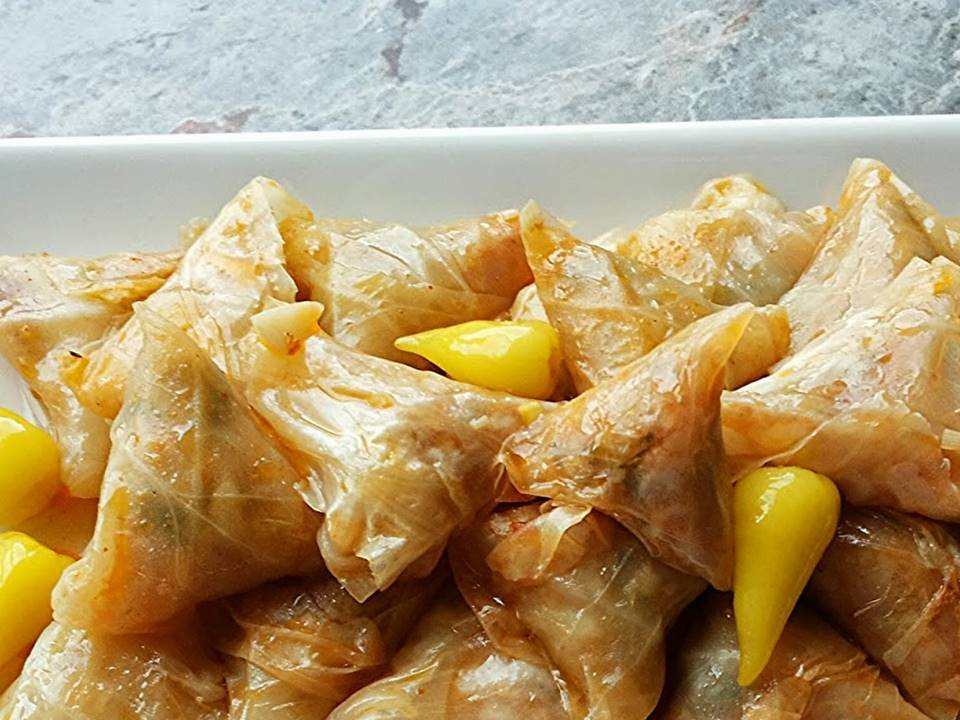 6 - يُوضع ملعقة صغيرة من خليط اللحم على الطرف العريض لشريط الكرنب، ثم يُلف تماماً مثل طريقة شرائط السمبوسك حتى يُصبح مُثلث الشكل، كما يُمكن لفه بالطريقة المُعتادة.